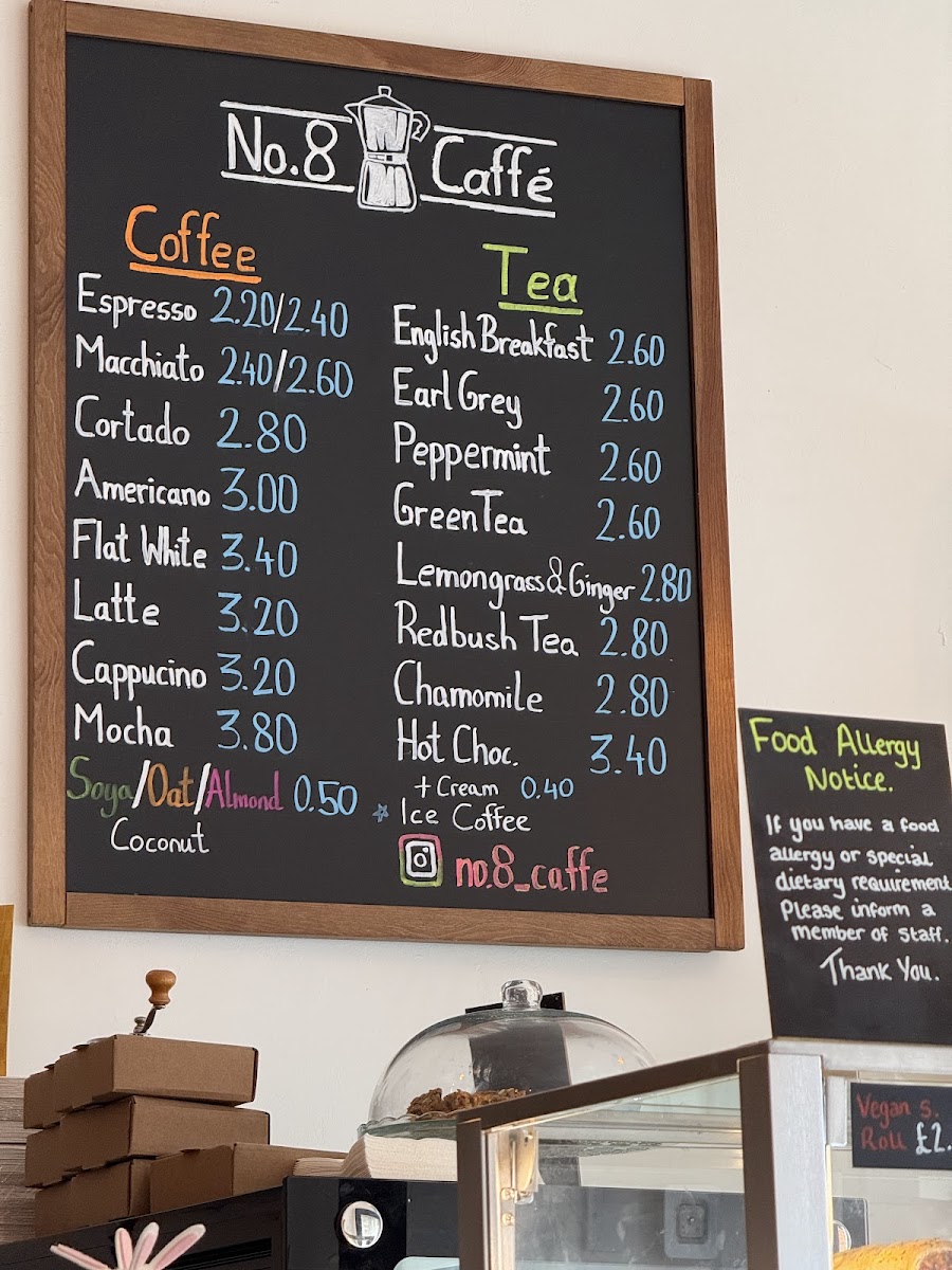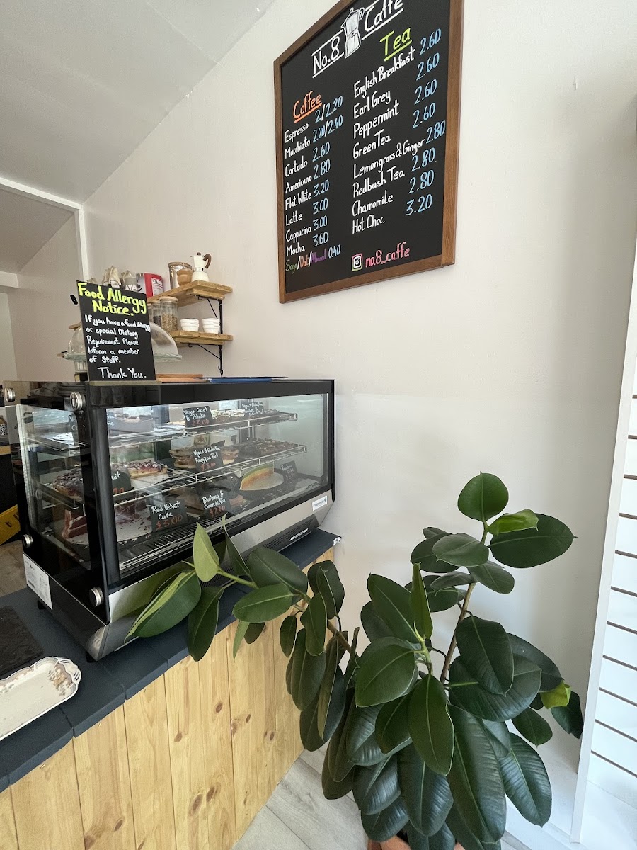 The menu at No.8 Caffe is organized to cater to a range of tastes with a focus on quality coffee and light refreshments. Visitors can choose from a variety of coffee options, including classic espresso-based drinks such as Espresso, Macchiato, Cortado, Americano, Flat White, Latte, Cappuccino, and Mocha. These beverages suit different preferences for strength and milk content, making the menu suitable for coffee breaks throughout the day.